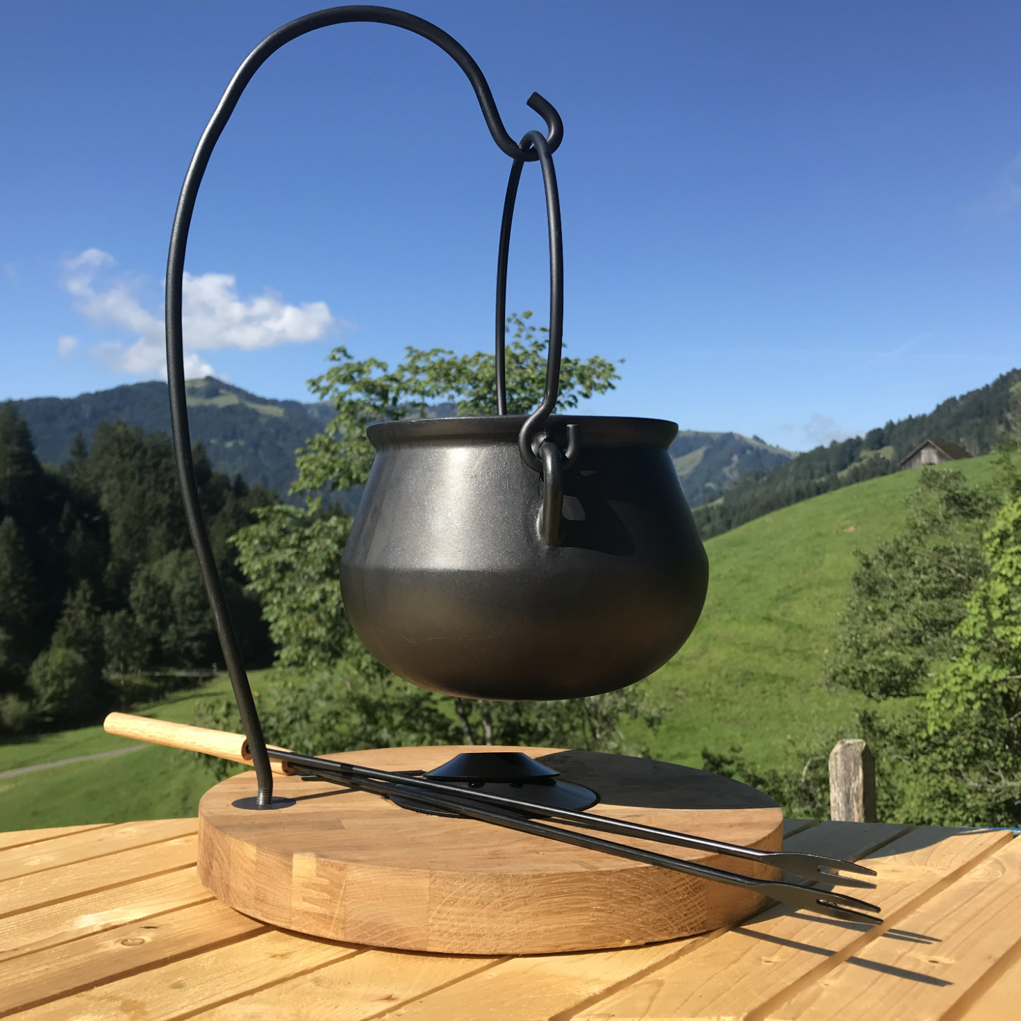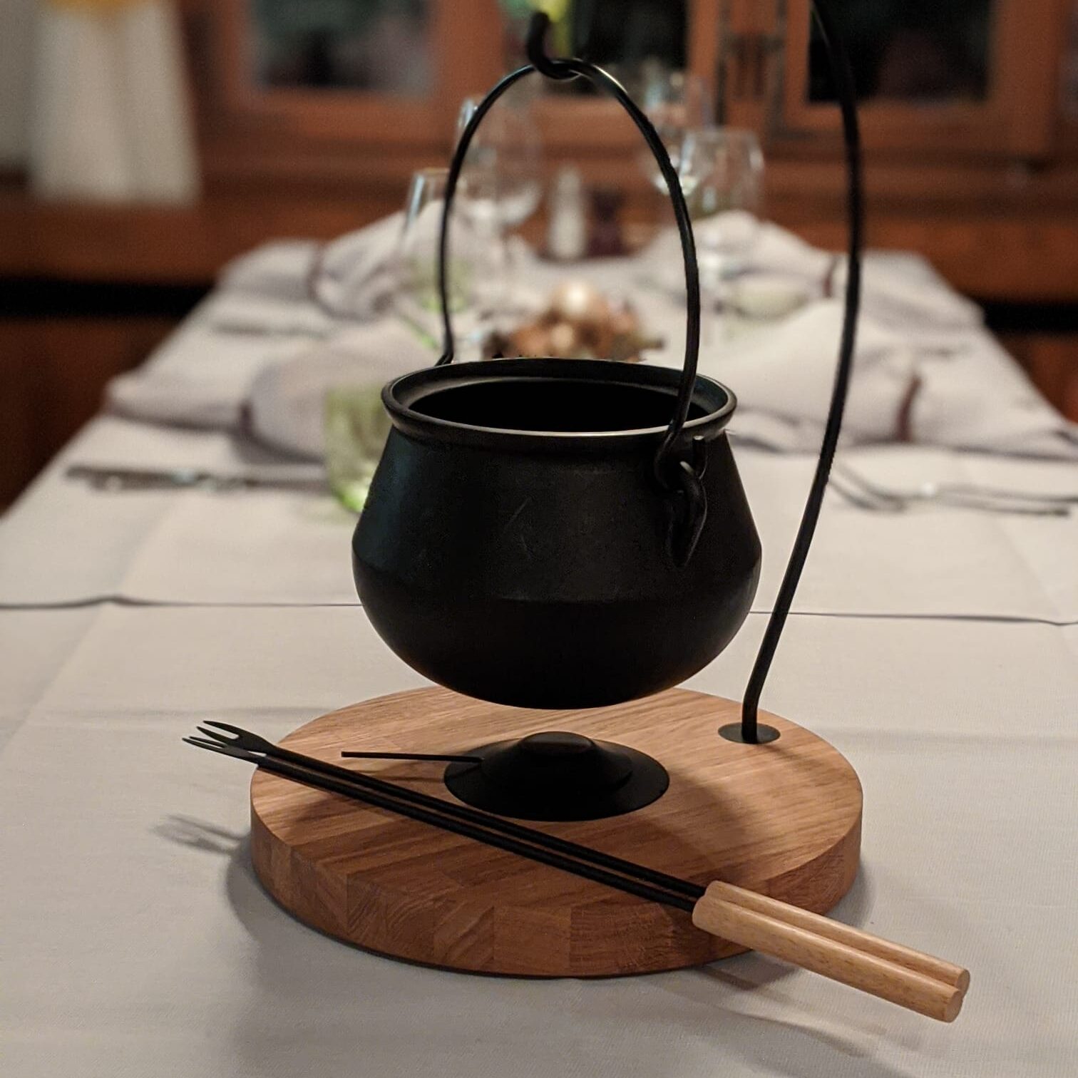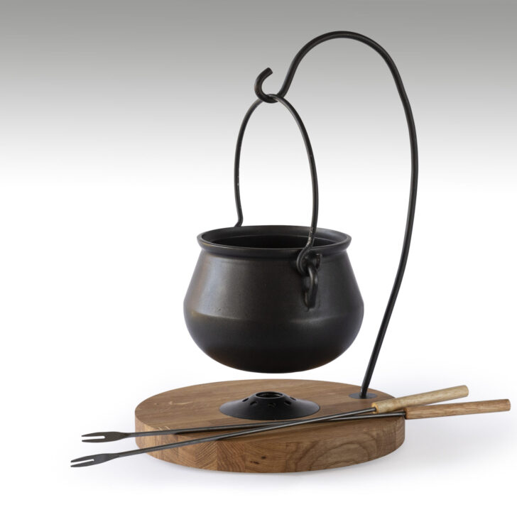 Der Topf erinnert an eine alte Herdstatt, als noch über dem offenen Feuer gekocht wurde. Er eignet sich – mit dem entsprechenden Deckel – auch für Fondue-Chinoise oder ganz einfach auch als Suppentopf auf Ihrem Esstisch.
